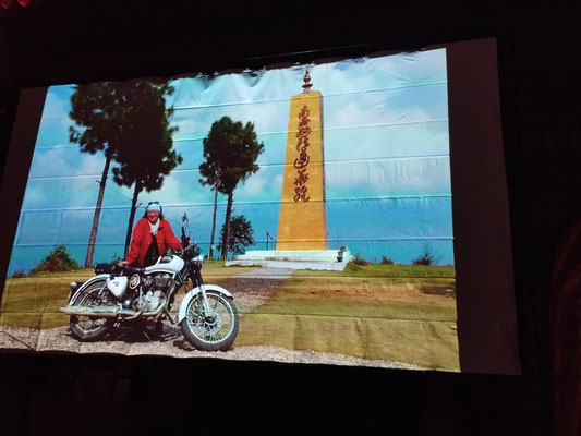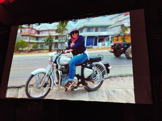 Michi Müller, eine sympathische Sächsin, erzählte uns, wie sie nach 28 Jahren Führerscheinbesitz in Nepal endlich das Motorradfahren erlernte. Der dortige Verkehr und die abenteuerlichen Straßenverhältnisse schickten Michi durch eine harte aber effiziente Schule, woran Sie uns bildgewaltig und auch mit ehrlichem Rückblick auf die Rückschläge teilhaben ließ.