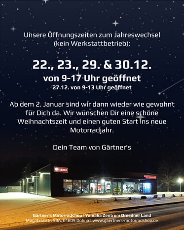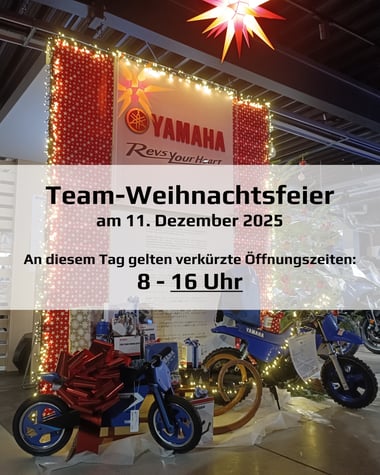 Liebe Kunden, zwischen den Feiertagen sind wir zu angepassten Zeiten für euch da: Unser Verkauf ist am 22., 23., 29. und 30. Dezember jeweils von 9 bis 17 Uhr, sowie am Samstag, den 27. Dezember von 9 bis 13 Uhr geöffnet. Bitte beachtet, dass in diesem Zeitraum kein Werkstattbetrieb stattfindet. Ab dem 2. Januar sind wir dann wieder wie gewohnt und mit vollem Service für euch da. Wir bedanken uns herzlich für euer Vertrauen im vergangenen Jahr und wünschen euch eine schöne, entspannte...